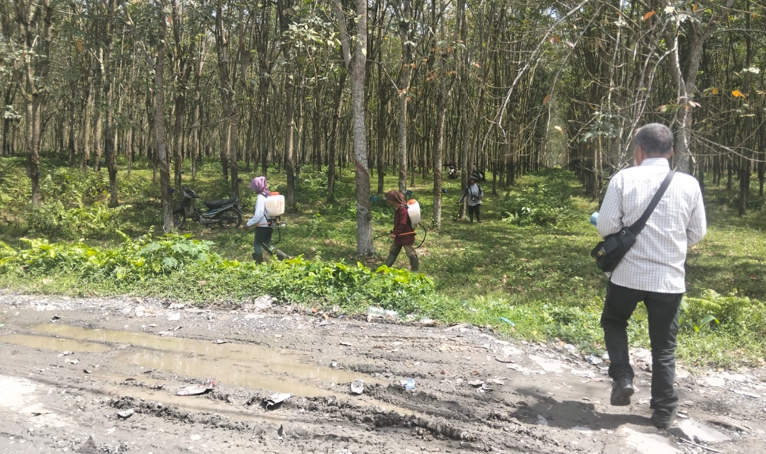 Pantauan di lapangan pada Kamis (19/2/2026), beberapa pekerja wanita terlihat melakukan penyemprotan gulma (chemical spraying) di areal tanaman karet produktif.