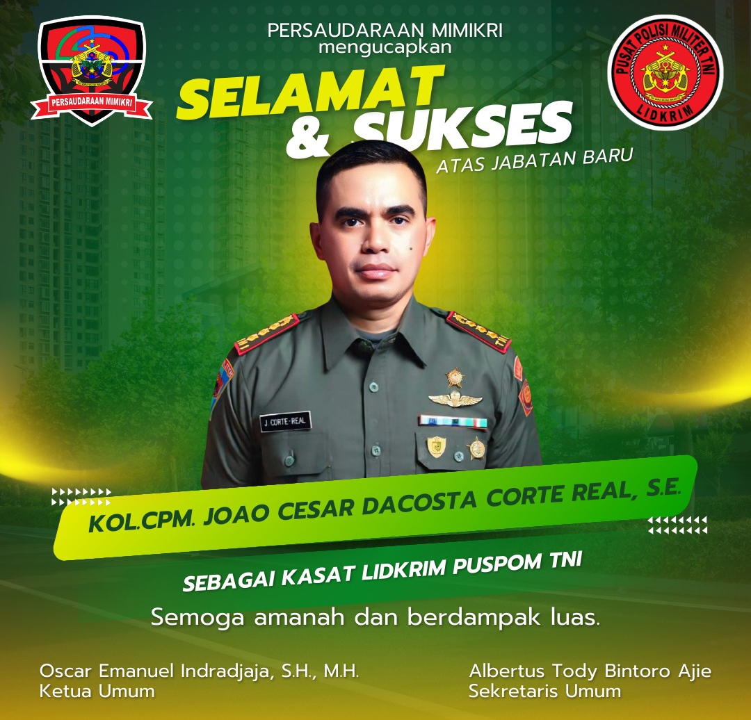 BeritaTrend.id|JAKARTA — Persaudaraan Mimikri menyampaikan ucapan selamat atas pengangkatan Joao Cesar Dacosta Corte Real sebagai Kepala Satuan Penyelidikan Kriminal di Pusat Polisi Militer TNI.