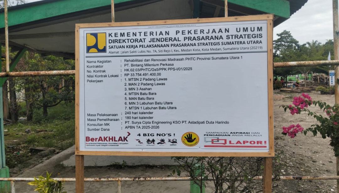 Di lokasi tersebut, terlihat plang proyek rehabilitasi madrasah yang mencantumkan pekerjaan di kabupaten lain seperti Batu Bara, Asahan, dan Padang Lawas dipasang secara bersamaan.